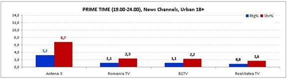 Şi în prime time, Antena 3 se menţine nr. 1 pe nişa de ştiri, cu o medie de 3,2% rating şi 6,7% share, o audienţă aproape triplă faţă de următorul clasat.