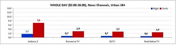 La nivelul întregii zile, în rândul publicului din mediul urban cu vârstă de peste 18 ani, postul de ştiri a înregistrat o medie de 1,7% rating şi 7% cotă de piaţă, adjudecându-şi astfel poziţia de lider în clasamentul televiziunilor de ştiri.