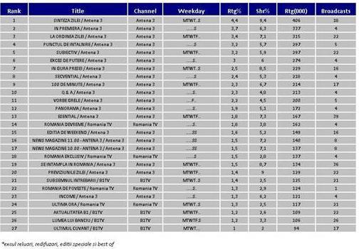 În topul emisiunilor difuzate de posturile de ştiri, primele 13 poziţii sunt ocupate de producţii ale Antenei 3, Sinteza Zilei cu Mihai Gâdea, În Premieră cu Carmen Avram, La Ordinea Zilei cu Dana Grecu şi Radu Tudor, Punctul de Întâlnire cu Radu Tudor şi Subiectiv cu Răzvan Dumitrescu fiind primele cinci clasate.