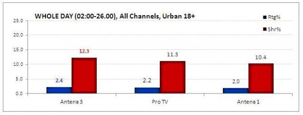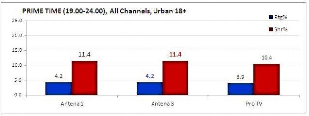Este a treia zi consecutiv in care televiziunea de nisa reuseste aceasta performanta in ultima perioada, romanii alegand sa urmareasca la Antena 3 nu numai desfasurarea evenimentelor din zona politica, dar si cele mai importante momente si informatii ale zilei. Seara, Antena 3 a impartit pozitia intai cu Antena 1, ambele posturi inregistrand in intervalul orar 19-24 o medie de 4.2% rating si 11.4% cota de piata, urmatoarea clasata fiind Pro tv.