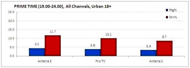 Seara, intre orele 19-24, un numar de 417.000 telespectatori au urmarit in fiecare minut programele Antena 3, iar media cotei de piata s-a ridicat la 11.7%.