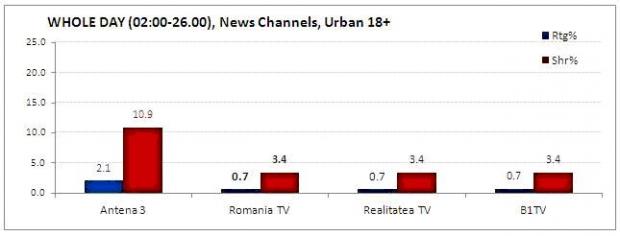 Kantar Media anunta pentru Antena 3 o medie de 2.1% rating si 10.9% cota de piata in cadrul targetului 18+ urban pe intreaga zi, cifre care distanteaza postul Intact de celelalte televiziuni informative.