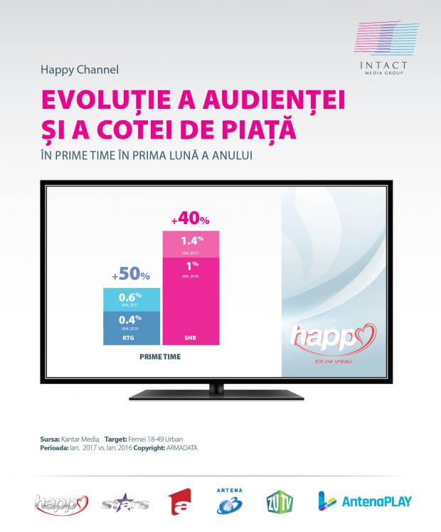 Happy Channel, postul dedicat femeilor curajoase, are creșteri ale audienței (+50%) și ale cotei de piață (+40%) în intervalul Prime Time, comparativ cu prima lună a anului trecut. Cele mai urmărite programe ale stației au fost “Elif”, “O poveste de iubire”, “Gossip Girl”, “Downton Abbey” și “Legea pământului”.