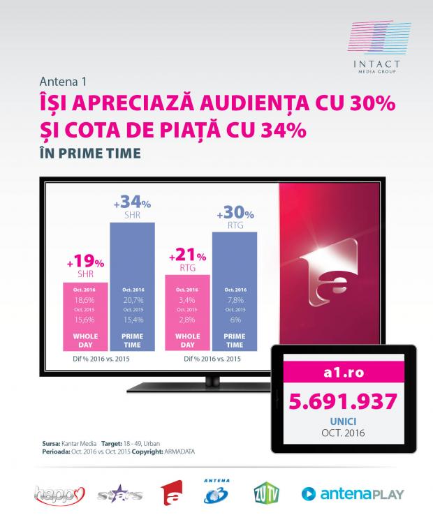 Antena 1, postul de divertisment cu cea mai mare familie de vedete din România, are creșteri ale audienței și ale cotei de piață pe majoritatea intervalelor orare, pe toate segmentele de public (comercial, urban, național) în luna octombrie 2016