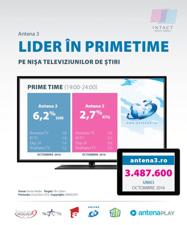Antena 3 conduce clasamentul posturilor de știri din România în luna octombrie pe cele mai importante intervale orare, printre care Dimineața, Access și Prime - Time.