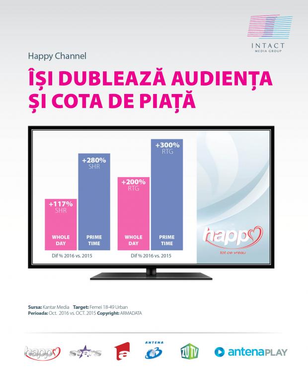 Happy Channel, postul dedicat femeilor, are creșteri spectaculoase ale audienței, dar și ale cotei de piață comparativ cu anul trecut, atât în luna octombrie, cât și pe întreaga perioadă de opt luni la lansare.
