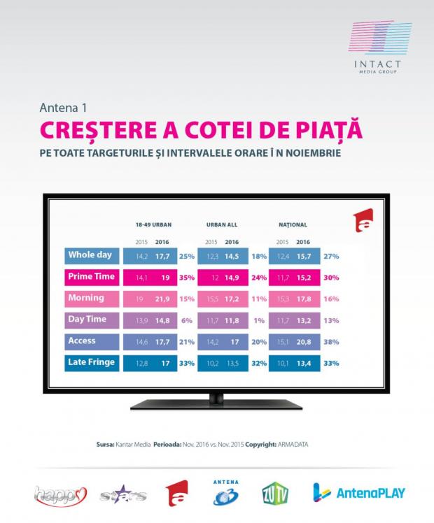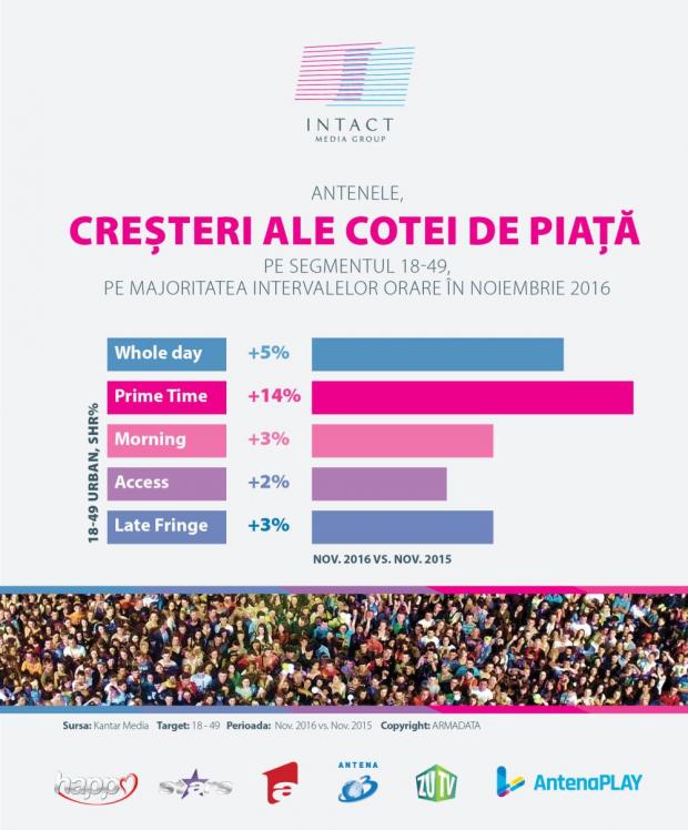 Target All Urban: posturile Intact conduc clasamentul audiențelor pe majoritatea intervalelor orare, printre care Whole Day și Prime Time. Creșteri ale cotei de piață, comparativ cu luna noiembrie 2015, se înregistrează pe cele mai multe slot-uri orare.