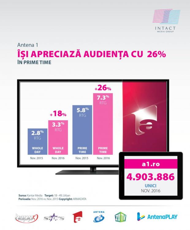 Antena 1, postul de divertisment cu cea mai mare familie de vedete din România, are rezultate spectaculoase în luna noiembrie. Astfel, se înregistrează creșteri ale audienței și ale cotei de piață pe majoritatea intervalelor orare, pe toate segmentele de public (comercial, urban, național).