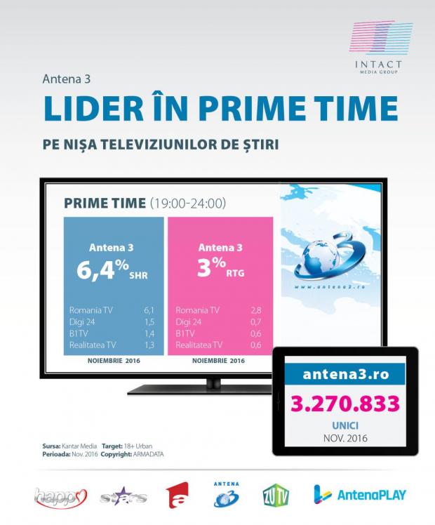 Antena 3 conduce clasamentul posturilor de știri din România în luna noiembrie pe cele mai importante intervale orare, printre care dimineața și Prime Time.