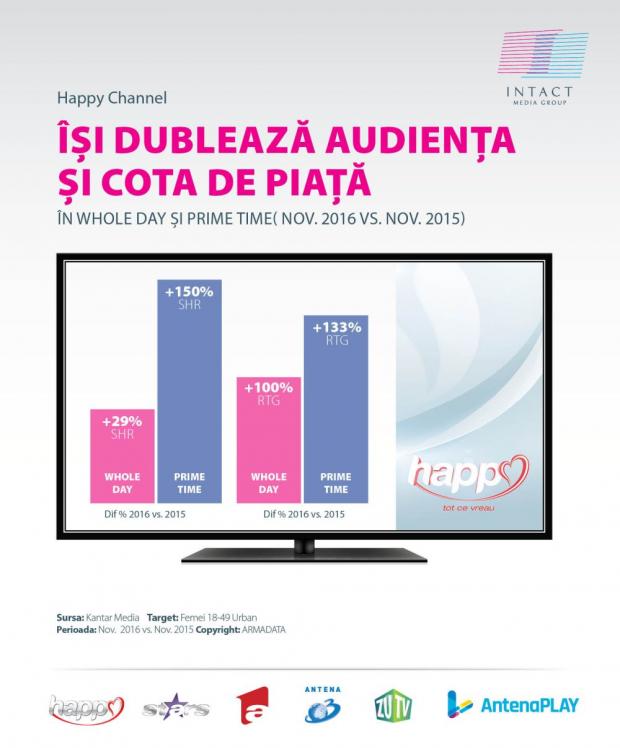 Comparativ cu luna noiembrie a anului trecut, se înregistreaza creșteri semnificative de audiență pe target-ul 18-49 Femei, postul dublându-și audiența în Whole Day și Prime Time. La nivelul cotei de piață, Happy Channel se apreciază cu 150% în Prime Time și 29% pe parcursul întregii zile. Cele mai urmărite programe ale stației au fost Elif, Dr. Hart în Bluebell, Te provoc să mă părăsești, Suits.