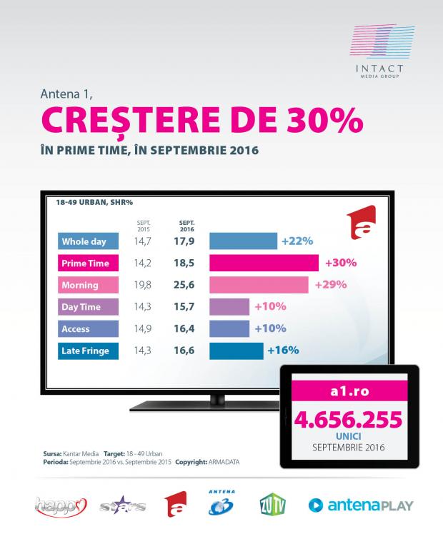 Antena 1, postul de divertisment cu cea mai mare familie de vedete din România, are creșteri ale cotei de piață pe TOATE intervalele orare și pe TOATE target-urile în luna septembrie 2016