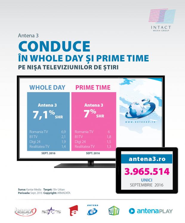 Antena 3 conduce clasamentul posturilor de știri din România în luna septembrie pe cele mai importante intervale orare, printre care întreaga zi și Prime Time.