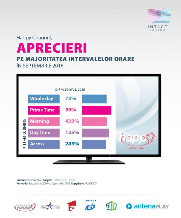Happy Channel, postul dedicat femeilor, are creșteri spectaculoase ale cotei de piață comparativ cu anul trecut, atât în luna septembrie cât și pe întreaga perioadă de șapte luni de la lansare.