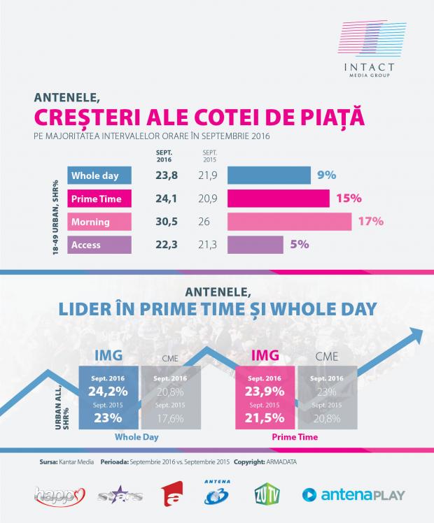 Target All Urban: posturile Intact conduc clasamentul audiențelor pe majoritatea intervalelor orare, printre care whole day și prime time. Creșteri ale cotei de piață, comparativ cu luna septembrie 2015, se înregistrează pe cele mai multe slot-uri.