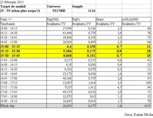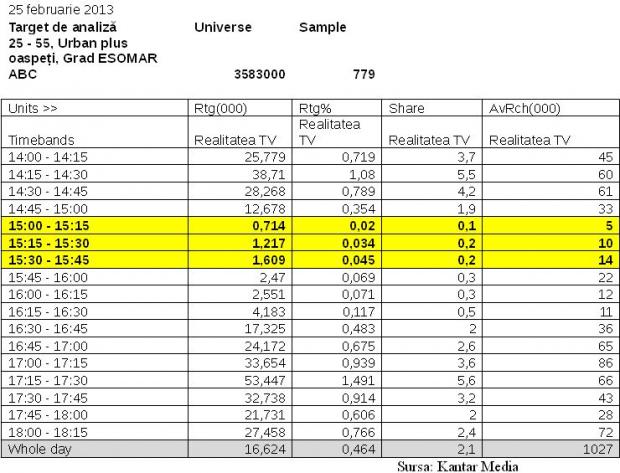 Conform analizelor se observă că la data de 25.02.2013, pe intervalul orar 15:00-15:45, pe oricare dintre sferturile de oră au existat telespectatori care s-au uitat la postul Realitatea TV", se arată în documentul remis de Consiliul director al ARMA.
