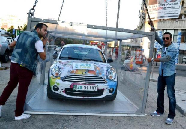 Buzdugan si Morar si-au salutat ascultatorii astazi in direct din centrul Bucurestiului, mai exact, de la Piata Unirii. Vedeta emisiunii a fost insa o masina sport care a fost ridicata la 30 de metri de pamant, spre uimirea tuturor trecatorilor. Pe 17 decembrie aceasta isi va gasi un proprietar printre fanii Radio ZU. Cei care vor sa puna mana pe noul Mini Cooper Coupé trebuie sa stea cu urechea pe ZU si sa fie atenti atunci cand Buzdu si Morar vor da startul la concurs. Pana atunci masina cu numarul de inmatriculare „ZU 01 HIT” poate fi admirata in Piata Unirii. De jos in sus.