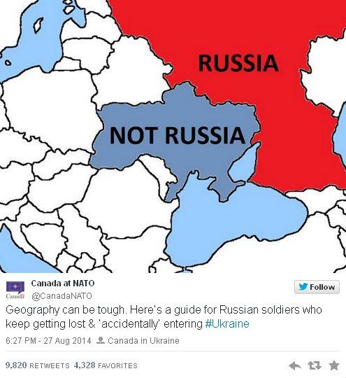 "Geografia poate fi dificilă. Acesta este un ghid pentru soldaţii ruşi care se tot rătăcesc şi intră accidental în Ucraina", este mesajul care însoţeşte o hartă în care Federaţia Rusă este colorată cu roşu, iar în zona Ucrainei, colorată în albastru, este scris "not Russia".
