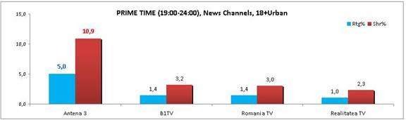 Seara, ierarhia posturilor de ştiri a rămas aceeaşi, Antena 3 ocupând poziţia de lider cu o medie de 5% rating şi 10,9% share.