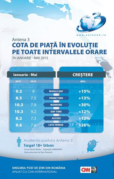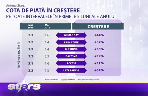 - Audienţele Antena Stars au şi în intervalul ianuarie – mai 2015 un trend puternic ascendent, cea mai importantă apreciere fiind inregistrata în Day Time, de 36%. Politica postului de a difuza cele mai interesate știri mondene în timp real și de a avea invitați în platou pe protagoniștii evenimentelor care contează s-a concretizat in rezultate de audiență impresionante.