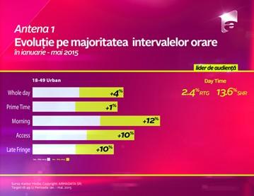 - “Antenele” sunt lider de audiență pe trei intervale orare pe targetul comercial – Morning, Access, Day Time – pe cinci intervale pe targetul All Urban – Whole Day, Morning, Day Time, Access și Late Fringe – și pe patru intervale pe targetul National – Whole Day, Day Time, Access și Late Fringe.