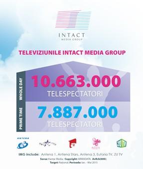 10.663.000 de români au urmărit emisiunile televiziunilor Intact, timp de cel puțin un minut, la nivel naţional, în Whole Day, in perioada ianuarie-mai 2015. În Prime-Time, numărul telespectatorilor este de 7.887.000 milioane telespectatori.