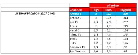 Clasamentul posturilor de televiziune din România, în intervalul de difuzare Un show păcătos, arată în felul următor: