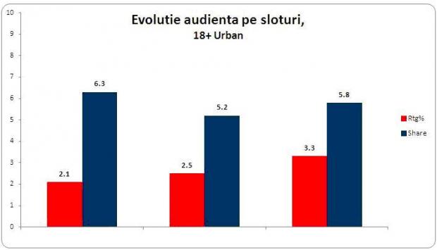 La o lună de la debut, audienţele medii înregistrate, în ordine, pe aceste sloturi orare, sunt 2,1% rating – 6,3% cotă de piaţă, 2,5% rating – 5,2% share, respectiv 3,3% rating şi 5,8% cotă de piaţă.