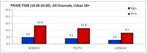 De altfel, Antena 3 a depasit toate celelalte posturi tv si seara, cand a obtinut un rating mediu de 4.9% si 13.6% market share, situandu-se in clasament atat inaintea televiziunilor informative, cat si a posturilor generaliste.