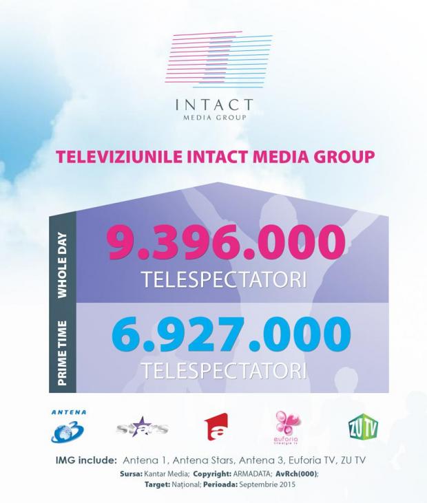 In medie, într-o zi obişnuită, 9.396.000 de români au urmărit emisiunile televiziunilor Intact, în luna septemb rie 2015, timp de cel puţin un minut, la nivel naţional, în Whole Day. În Prime-Time, numărul telespectatorilor este de 6.927.000 milioane telespectatori.