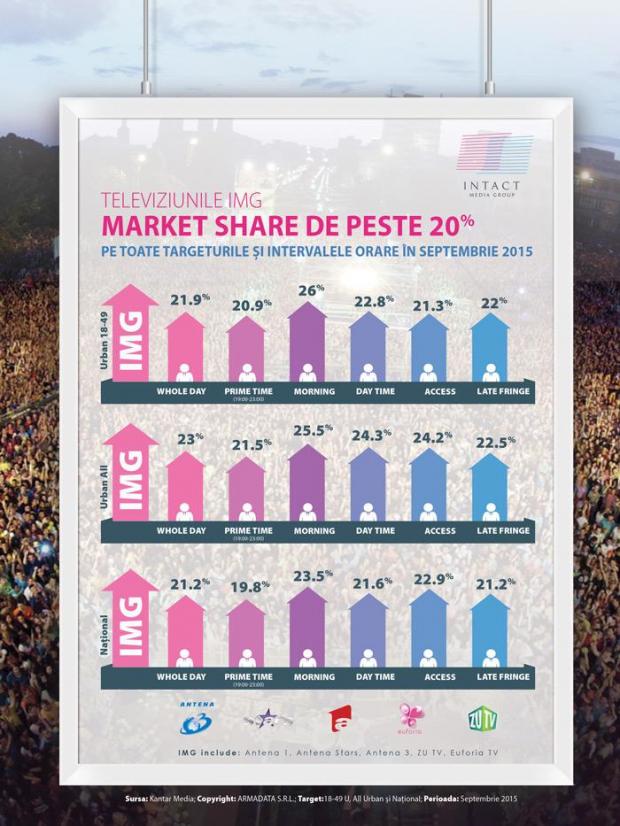 - În ceea ce priveşte target-ul All Urban, televiziunile Grupului Intact sunt lider pe cinci intervale orare, incluzând Prime-Time-ul. În Morning, diferenţa dintre trustul care deţine Antenele şi CME este de o zecime, respectiv 25,5 % market share versus 25,6% CME. Pe toate celelalte intervalele orare, Intact este lider autoritar de audienţă.