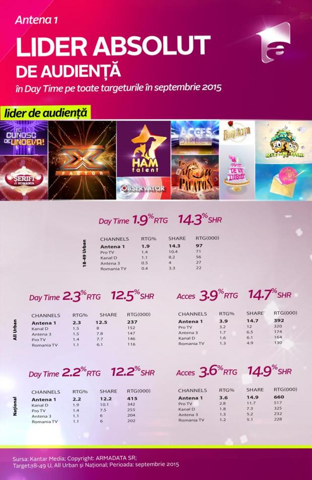- La nivelul target-ului comercial, “Antenele” sunt lider de audienţă în Day Time şi Late Fringe.