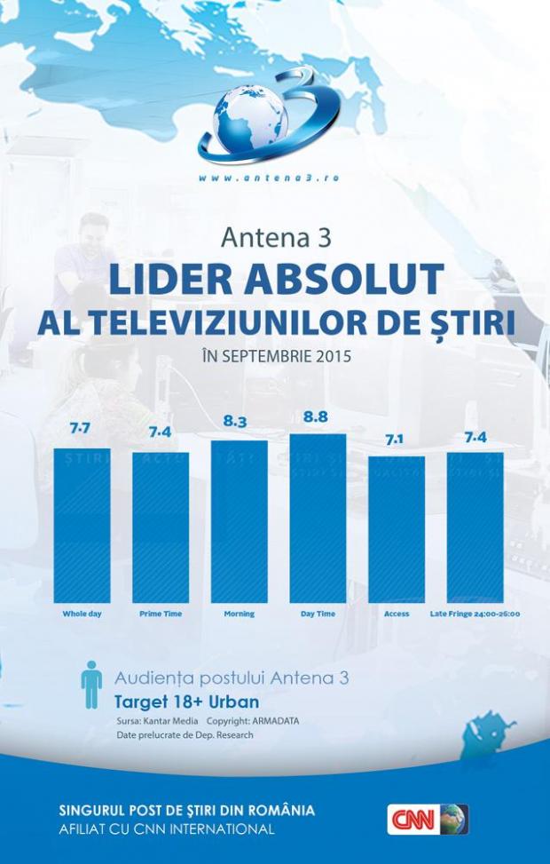 - În ultima săptămâna din septembrie, Antena 3 şi-a îmbunătăţit afinitatea comparativ cu săptămâna anterioară, după cum urmează: în Whole Day, la categoria 18+ AB Urban (manageri şi profesionişti), afinitatea a crescut cu 9%, ajungându-se la 161,8%.