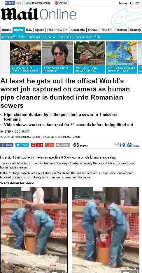 Daily Mail scrie că acesta este "cel mai rau job din lume" şi că în România oamenii sunt folosiţi pe post de instrumente de curăţat sistemul de canalizare.