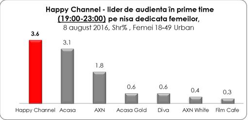 Cu astfel de performanţe de audienţă, Happy Channel demonstrează că este un post în ascensiune, aflata în topul preferinţelor femeilor cu vârste cuprinse între 18 şi 49 de ani.