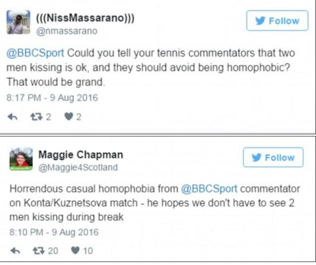 ”BBC Sport, poți să le spui comentatorilor tăi de tenis că e ok ca doi bărbați să se sărute și că ar trebui să evite să fie homofobi? Ar fi minunat”, a postat un tânăr pe Twitter.