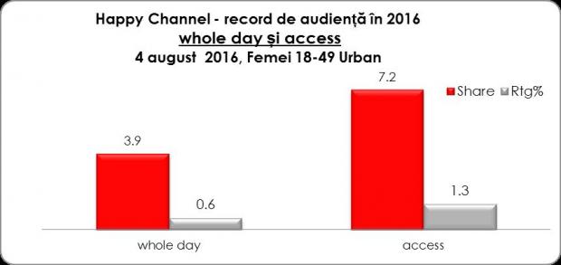 În Access, interval orar 16 – 19,00, valoarea market-share-ului înregistrată de Happy Channel a însemnat şi un record de audienţă pentru post. În acest interval orar au fost difuzate producţiile “Chemarea destinului” şi “Fiorella spune da”.