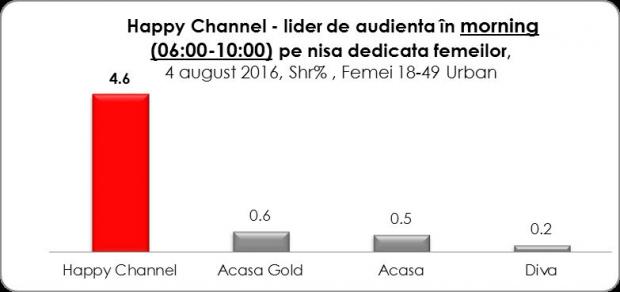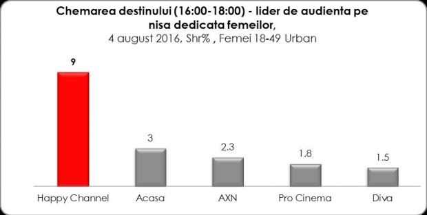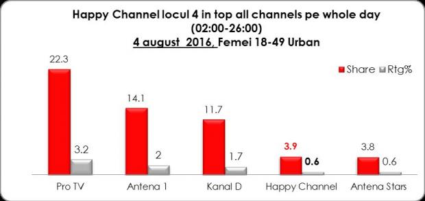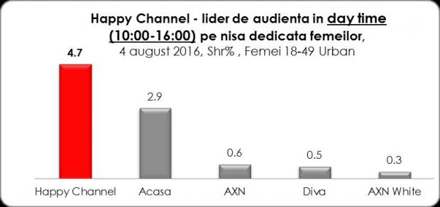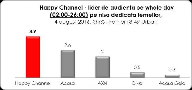 Happy Channel, postul Intact Media Group dedicat femeilor cu vârste cuprinse între 18 – 49 de ani, a înregistrat joi, 4 august, noi recorduri de audienţă în istoria staţiei si a fost lider de audienta detasat pe nisa televiziunilor dedicate publicului feminin. 3,9 % market share în Whole Day şi 7,2 % market share, în Access (interval orar 16,00 – 19,00) sunt coordonatele cele mai înalte atinse până acum de Happy.![]()