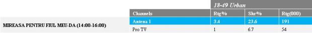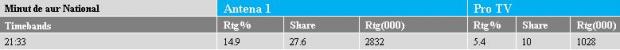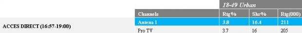 De asemenea, in prime time, pe targetul all urban, postul de televiziune din Baneasa obtinea, in medie, un share de 20,4% si 10.3 puncte de rating, adjudecandu-si prima pozitie a clasamentului, in vreme de postul concurent Protv, avea, in acelasi interval orar, si pe acelasi target, o medie de doar 14,3% share si 7,2% rating. In medie, in intervalul orar 19.00 si 23.00, 1.079.000 de telespectatori urmareau productiile ANTENEI 1, in timp ce doar 756.000 de romani priveau emisiunile Pro-ului.