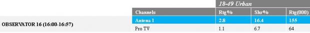 Unul dintre cele mai importante brand-uri in randul jurnalelor de stiri din Romania, Observator 16.00, s-a instalat din nou, pe prima pozitie a topului audientelor. Jurnalul prezentat de Mihaela Calin a obtinut un share de 16,4% si un rating de 2,8%, pe publicul 18-49 urban, iar Protv reusea sa aiba doar un share de 6,7% si un rating de 1,1%.