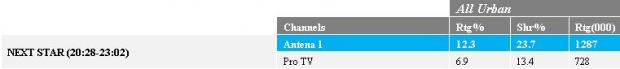 Next Star, show-ul atat de iubit de telespectatorii ANTENEI 1, si-a aratat inca o data forta, fiind din nou, lider absolut de audienta. In medie, pe publicul all urban, show-ul prezentat de Dan Negru a obtinut un share de 23,7 % si 12,3% rating, in vreme de Protv, care, pe acelasi interval, avea doar 13,4% share si un rating de 6,9%. In medie, cei mai talentati copii ai romanilor au fost urmariti de1.287.000 de telespectatori, in vreme de doar 728.000 de oameni priveau partida de fotbal dintre Rapid-ACS Petrolul, dar si Stirile Pro Tv de la ora 22.30.