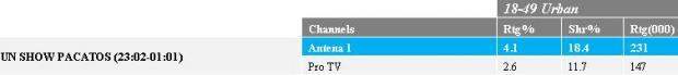 Campionul noptilor albe, Dan Capatos, a aratat inca o data ca isi merita din plin titulatura. Astfel, pe segmentul de public 18-49 urban, “Un show pacatos” reusea o cota de piata de 18,4 share si un rating de 4,1%, , iar programul Pro Tv-ului obtinea un share de 11,7% si un rating de doar 2,6%. In medie, 231.000 de romani insomniaci se distrau la show-ul ANTENEI 1, si doar 147.000 de telespectatori au ales sa privesca filmele difuzate de Pro Tv.