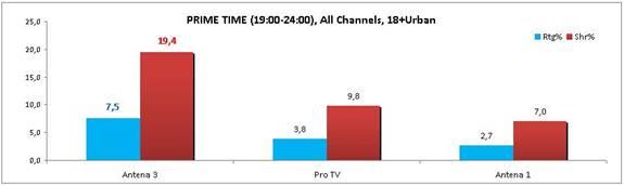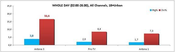 Antena 3 a înregistrat o medie de 16,6% cotă de piaţă şi 3,8% rating la nivelul întregii zile, pe targetul 18+ urban, ocupând astfel poziţia de lider, depăşind toate celelalte posturi TV.