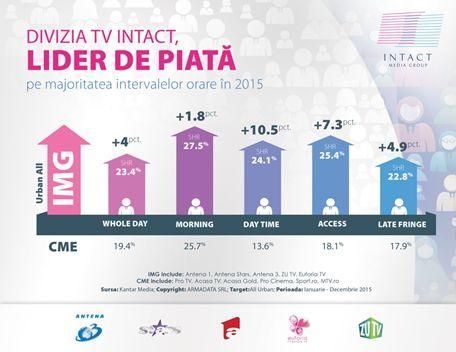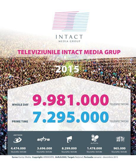 In 2015, Antenele conduc în Day Time și Access la nivelul target-ului comercial precum și pe majoritatea intervalor orare în rândul românilor din mediul Urban și National. De asemenea, la nivel de trust, televiziunile Intact sunt pe primul loc la nivelul întregii zile.