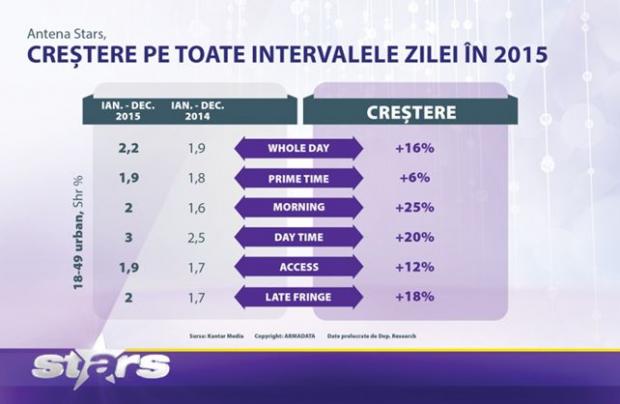 Postul Antena Stars a fost urmărit, în 2015, în Whole Day, de 3.696.000 de români din întreaga țară, timp de cel puțin un minut.
