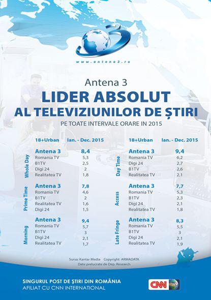 Postul Antena 3 a fost urmărit, în 2015, în Whole Day, de 4.474.000 de români din întreaga țară, timp de cel puțin un minut.