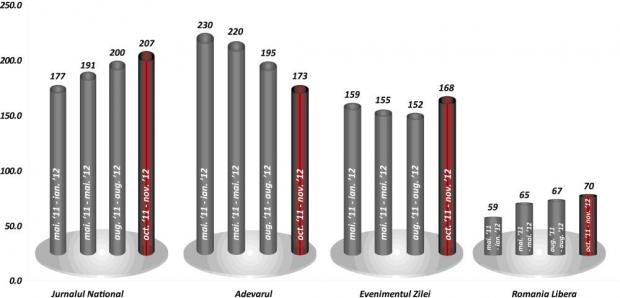 Conform datelor publicate de Biroul Român de Audit al Tirajelor (BRAT) pentru perioada octombrie 2011- noiembrie 2012 următorii clasaţi sunt Adevărul cu 173.000 de cititori pe ediţie, Evenimentul zilei cu 168.000 de cititori pe ediţie şi, la mare distanţă, România Liberă cu 70.000 de cititori.