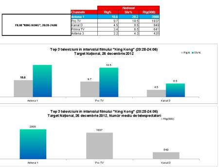 Astfel, Antena 1, a inregistrat, in intervalul orar 20,28 – 24,06, un rating de 10,6% si o cota de piata de 20,2 %, echivalentul a peste doua milioane de telespectatori. 22,25 a fost minutul de aur al serii, cand, la King Kong se uitau peste trei milioane de telespectatori, in timp ce audienta Pro TV era la jumatate, de aproximativ 1,573.000 privitori.