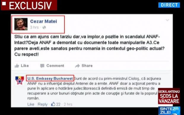 Mihai Gâdea a abordat în emisiune subiectul declarațiilor făcute de ambasadorul SUA la București, pe pagina de Facebook a Ambasadei, în cursul unei sesiuni de chat referitoare la situaţia în care se află cele cinci televiziuni ale trustului Intact, după descinderile ANAF din 15 februarie 2016.