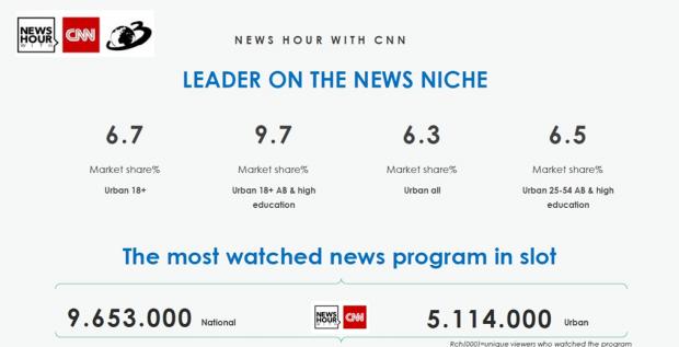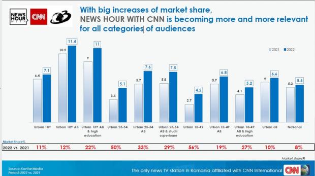 News Hour with CNN şi-a consolidat poziția de lider prin creşteri semnificative ale cotei de piață, pe toate segmentele de public. Cel mai important slot de ştiri pentu canalele informative a avut o creştere spectaculoasă de audiență în mod special pe publicul comercial, cel mai dinamic segment din România.