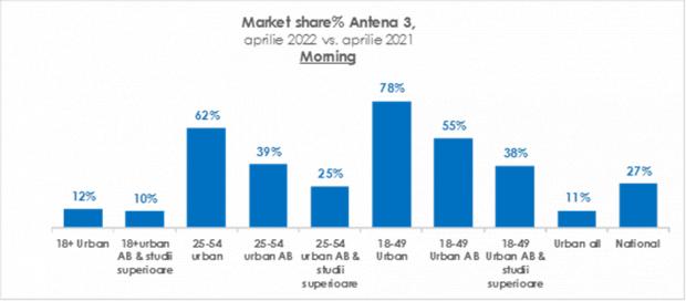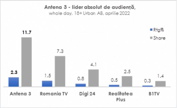 Pe întreaga zi, Antena 3 este lider absolut de audiență pe categoriile 18+ urban, 18+ urban AB, 25-54 urban, 25-54 urban AB și 18-49 urban AB.